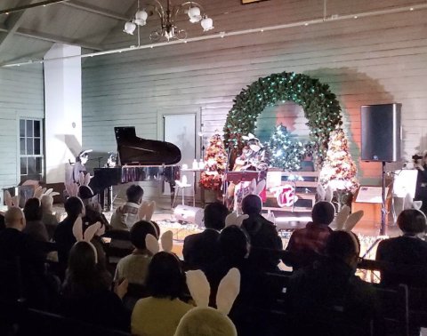 開場と同時に時計台へ吸い込まれていく人々の目に飛び込んで来たのは、クリスマスの飾りつけを施されたステージや、趣のあるホールに取り付けられた、小さな星のような照明。座席にはウサギの耳飾りの可愛らしいグッズが置かれ、そこかしこに人の手がかけられたぬくもりを感じる。
