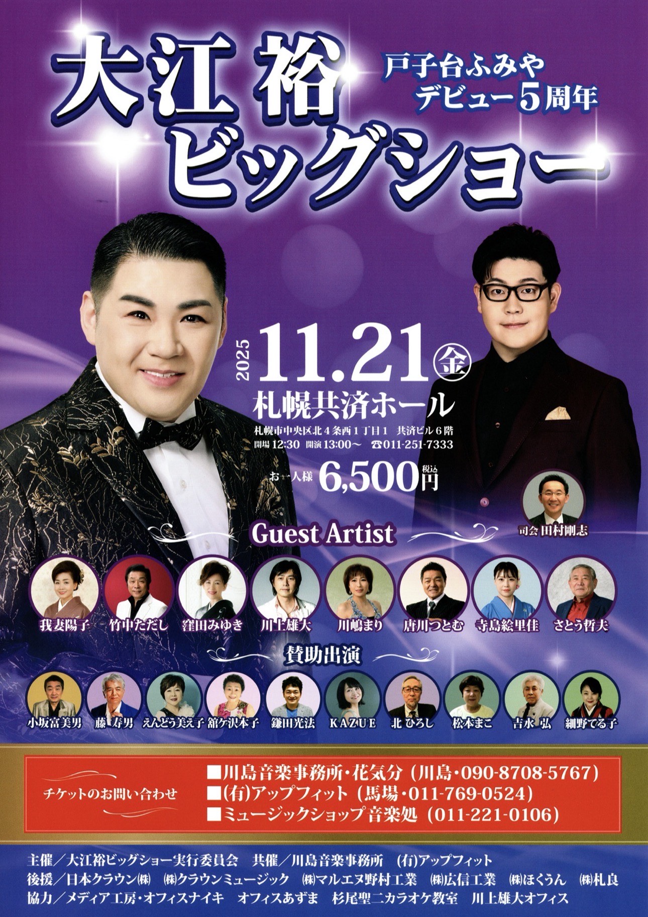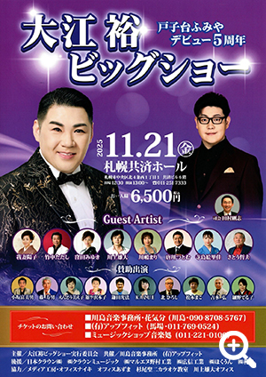 札幌大通公園のライトアップが始まり、いよいよ冬本番の到来を感じる頃となった11月21日、札幌共済ホールで大江裕とデビュー5周年を迎える戸子台ふみやのコンサートが開かれた。